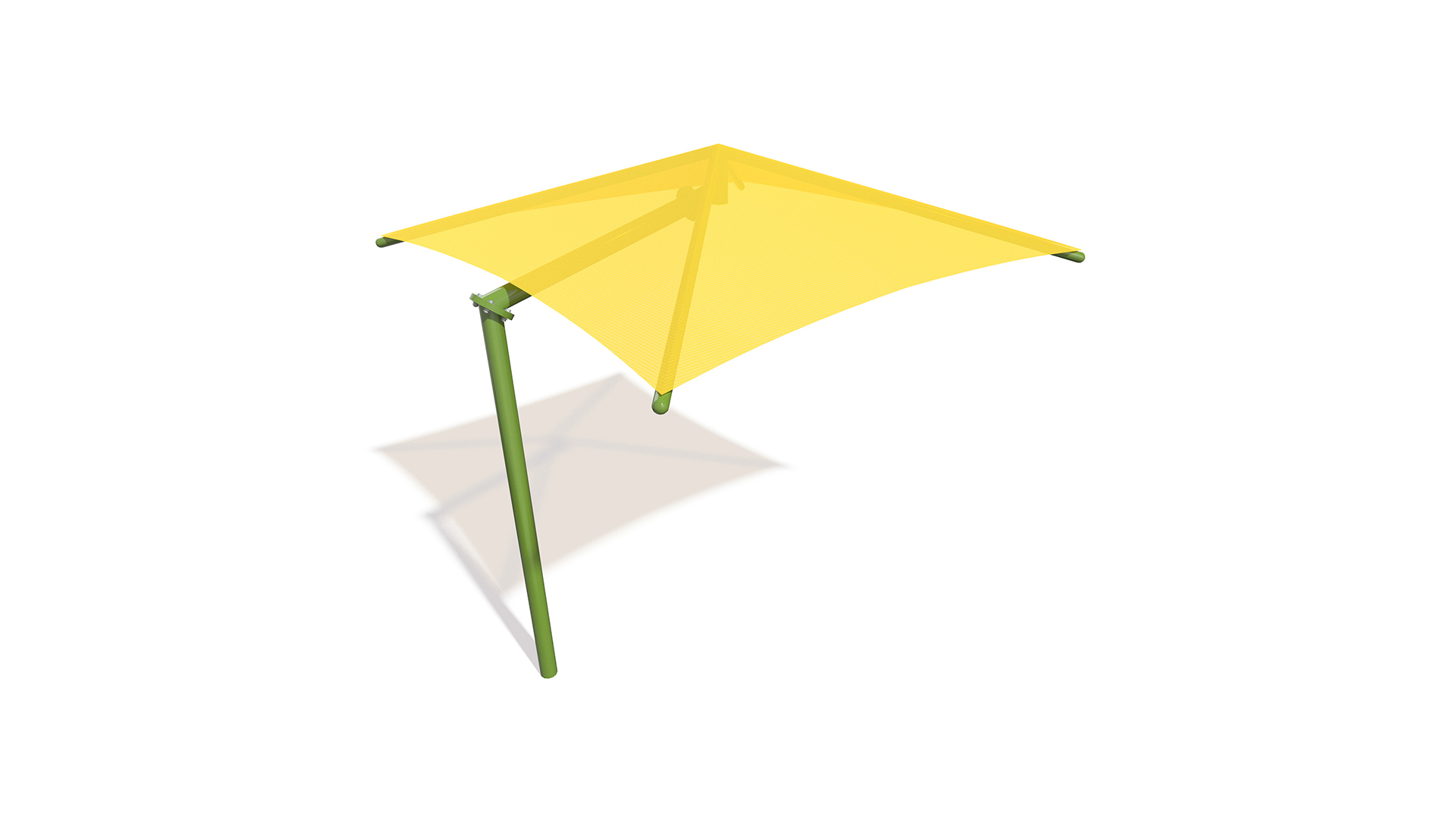 [video: Camera views the top of a yellow triangle shade sail connected to three posts. Camera switches back to Jonathan as he points to the rapid release system on one of the posts.]