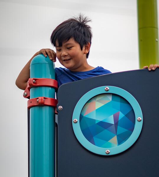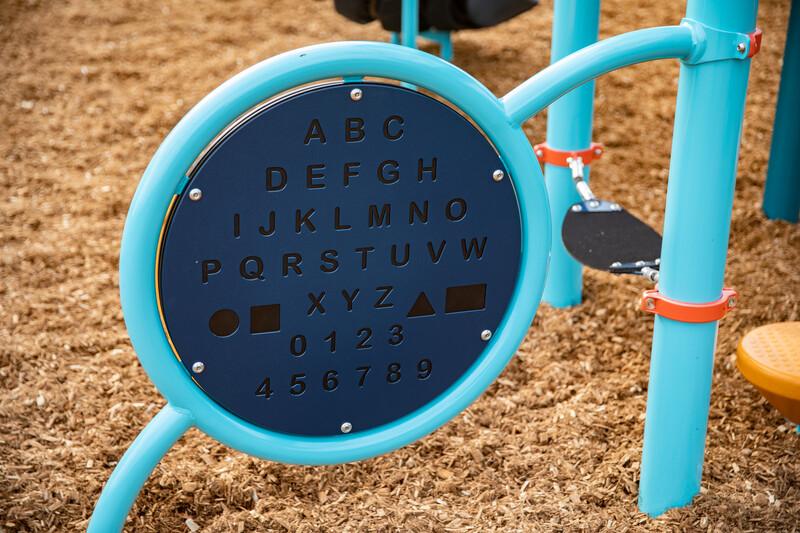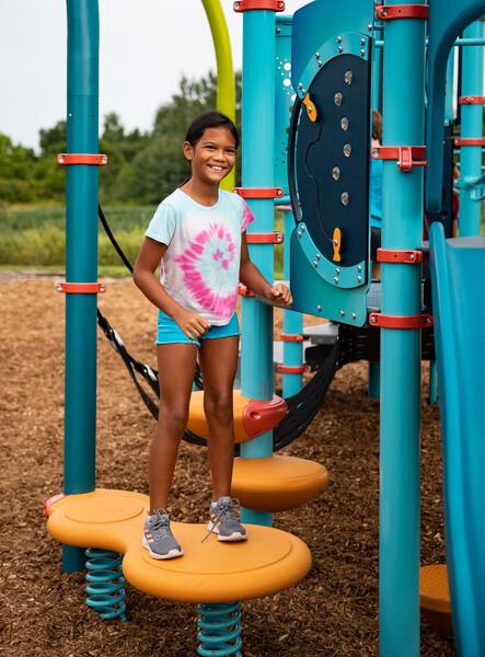 [video: a young girl climbs across an arch belted climber to a rope climber connecting to the playground decking. The camera focuses on a girl as she plays with small orange fish that slide up and down a play panel. The camera zooms in to the girl’s hand as she slides one of the orange fish up the panel. Scene switches to a girl as she riders down the large wide slide of the play structure.]