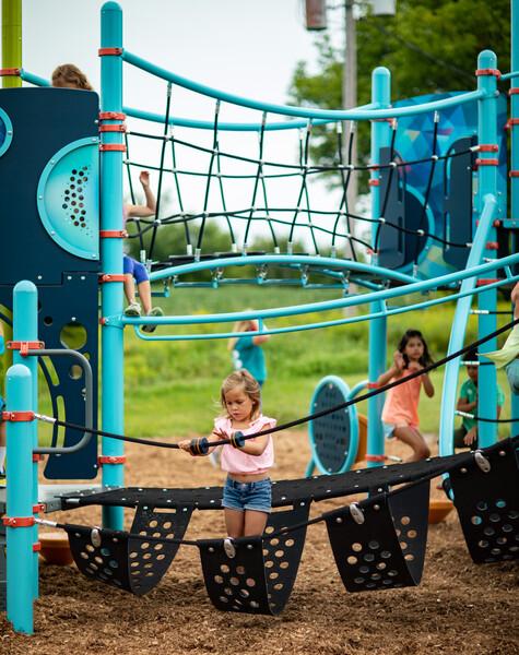 [video: camera focuses on a girl as she climbs on the wave like belt climbers and rope climbers on the structure. The camera pans over to another girl as she jumps from the arched belted climber down to a belted hammock like climber below. Camera switches to a full elevated view of the fenced in play area next to a brick building with blue and grey accents. Camera switches back to the play structure as a boy steps off a belted bridge with other smaller belt steppers branching off of itself. The camera focuses on children’s feet as the sway and wiggle the arched belt climber. A girl quickly rides down the large blue slide.]