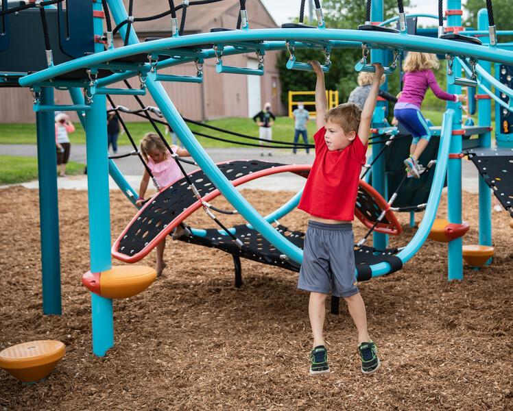 [video: the camera rotates slowly to the right with a full bird’s eye view of the entire fenced in play area. With a ground view focuses up at the top of the large blue slide a boy sits, he pushes off with his hands as he glides down the slide. The camera pans down following him as he reaches the bottom of the slide. Two girls climb across on of the arched belted climbers stabilizing themselves with rope hand holds on either side of them. Scene switches to a boy as he speaks to the camera.]