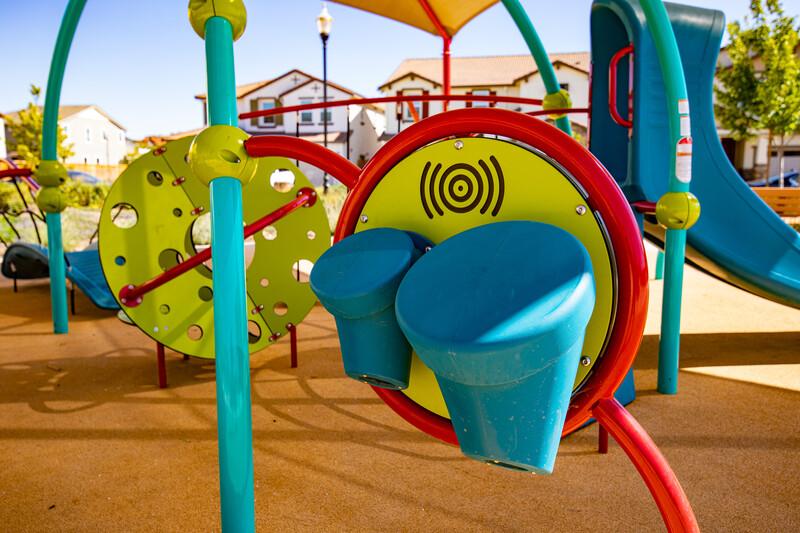 [video: scene fades into a Weevos play structure as children play all around on the different playground activities. Scene switches to a full view of the Bongo Panel with two drums. Scene switches to a close-up of the bongo panel as a boy and girl bang on the tops of the drums. Scene switches to a girl as she plays the Bongo panel by herself. The camera zooms in on the girl’s faces. She turns to the camera and smiles while she plays the drums. Scene switches to a side view of the girl as she continues to play the drums louder. She stops playing and walks away from the panel. Scene switches to another young girl as she bangs on the two drums of the Bongo Panel. Scene switches to a full view of the Weevos play structure with children playing all around. Two boys run chasing each other around the play area. A child off camera speaks.]