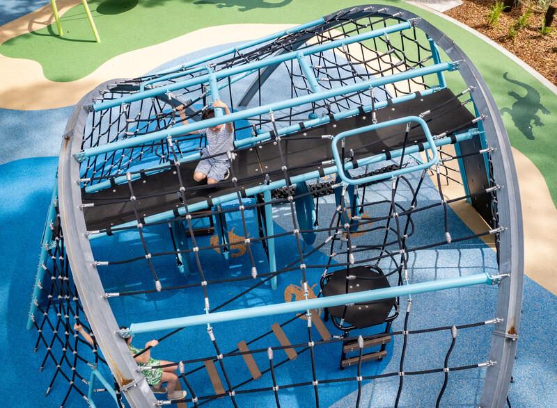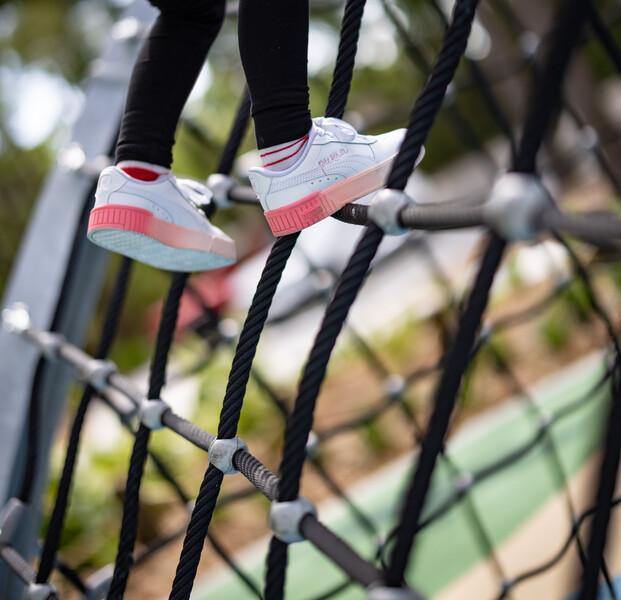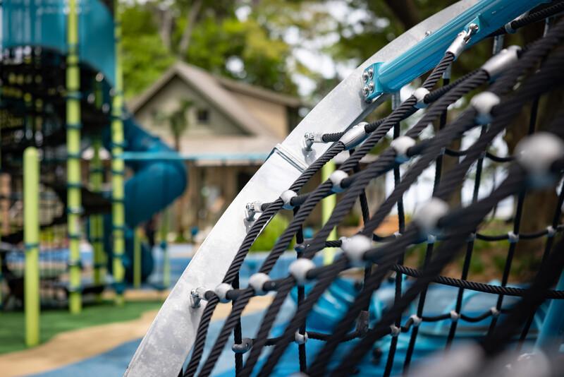 [video: camera zooms in on cable and Landscape Structures logo imprinted on the clamps of Crab Trap net climbing structure.]