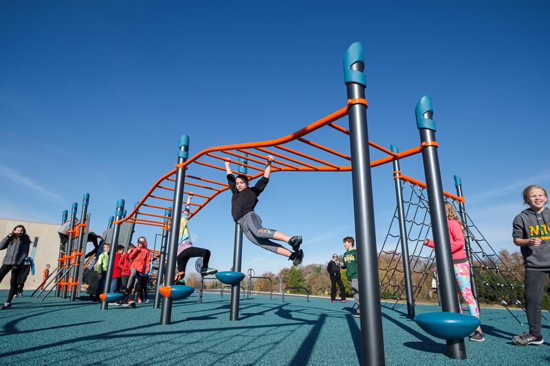 [video: close up view of young boy climbing on monkey bars. Camera switch to full view of monkey bars while young girl starts to swing through the bars.]