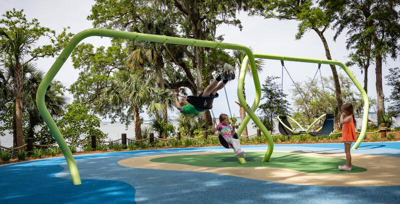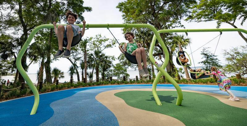 [video: scene switches to a top down view of the boy and girl as they swing on the friendship swing. Camera angle changes to a side view as the children continue to swing.]