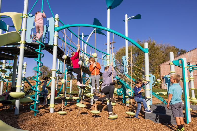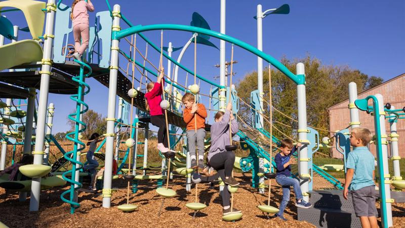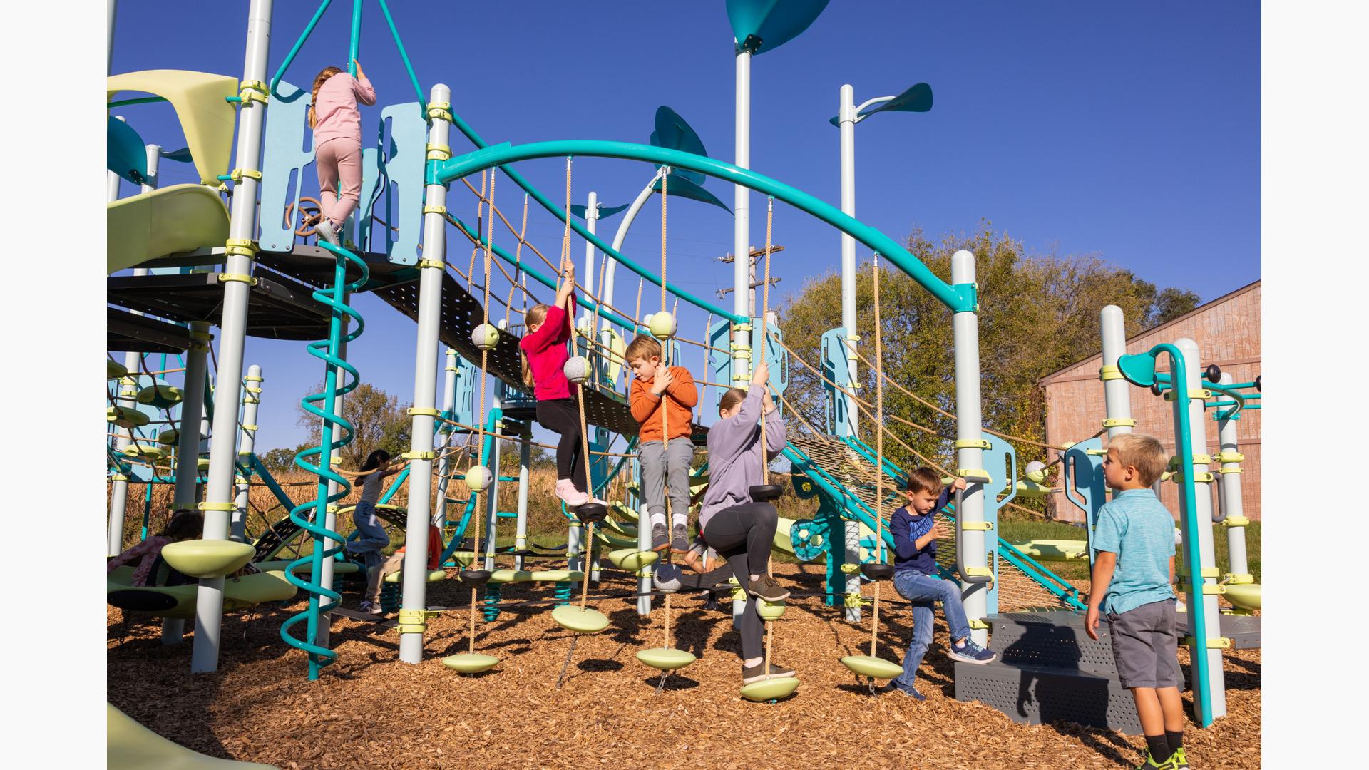 The SwiggleKnots™ Bridge Inclined has discs, pucks, and ball knots for multiple climbing experiences on every cable. The gradual increase in height adds an extra challenge for daring climbers. Kids will have fun creating their own path up, down, and across.