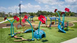 Contact Your ConsultantPlay is abloom at garden-themed Celebration Park in Tulsa, Oklahoma. This uplifting custom park is full of sensory delights that will intrigue curious children ages 2 to 12. Graceful flowers arc over the play structures from above, drawing attention to the sprawling PlayBooster® structure for children ages 5 to 12, with its multiple climbers, Double Swoosh® Slide, Horizontal Ladder and Sol™ Spinner. An adjacent section includes a Cozy Dome, Rhapsody® Outdoor Musical Instruments and adorable custom pod steppers decorated like ladybugs and toadstools. Children ages 2 to 5 will adore the climber and slide on the play structure sized just for them, and an accessible Oodle® Swing allows multiple children of all abilities to swing. Best of all, SkyWays® flower-shaped structures provide cooling shade over a nearby picnic area.
