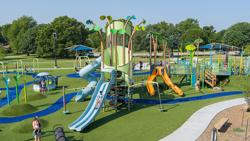 Design files are not available for this custom design. Contact your local playground consultant for additional details.Located in Whiteside Park, Hope Playground is Tulsa’s most inclusive play destination. Designed with accessibility at its core, this playground ensures that children of all abilities can enjoy every feature. The playground features a nature-inspired design with exciting, inclusive components like the Super Netplex® play functionally linked to another sprawling ramped playstructure. Both of which are packed full of climbing, sliding and sensory play experiences for kids ages 5 to 12. Toddlers and preschoolers have a play space dedicated to their developmental needs, which includes hillside climbers and slides. In addition to these play areas, there are freestanding play components like the We-Go-Swing®, We-Saw™, Roller Table™ and Sway Fun® glider to ensure an inclusive experience for all. There’s even a fitness area for visitors ages 13 and up. The entire play space is covered with turf safety surfacing to provide a fully accessible route throughout the playground. Even the thoughtfully chosen color scheme accommodates children who are blind/low vision or who are colorblind, making it a welcoming space for all. Hope Playground is the largest of its kind in Oklahoma, funded by the Sanford and Irene Burnstein Family Foundation, which named it to inspire hope for future inclusive projects in Tulsa and beyond.