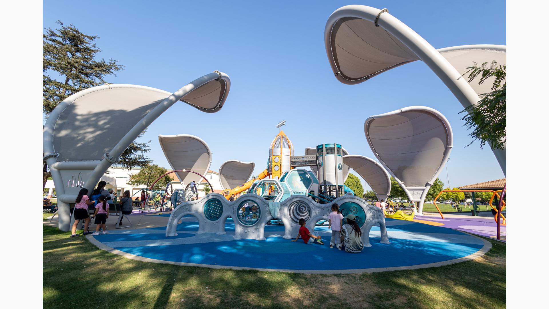 The stunning, colorful Live Oak Park playground in Temple City, CA isn’t just a place to play — it’s a cosmic adventure that's more like stepping into a science-fiction cartoon landscape that's unlike anything kids (or adults) have seen before. Designed with a bold, space-age theme, this destination playground rockets beyond ordinary play, transforming climbing, spinning, and swinging into an out-of-this-world experience.