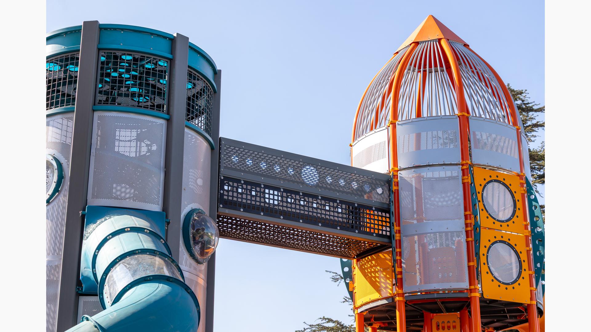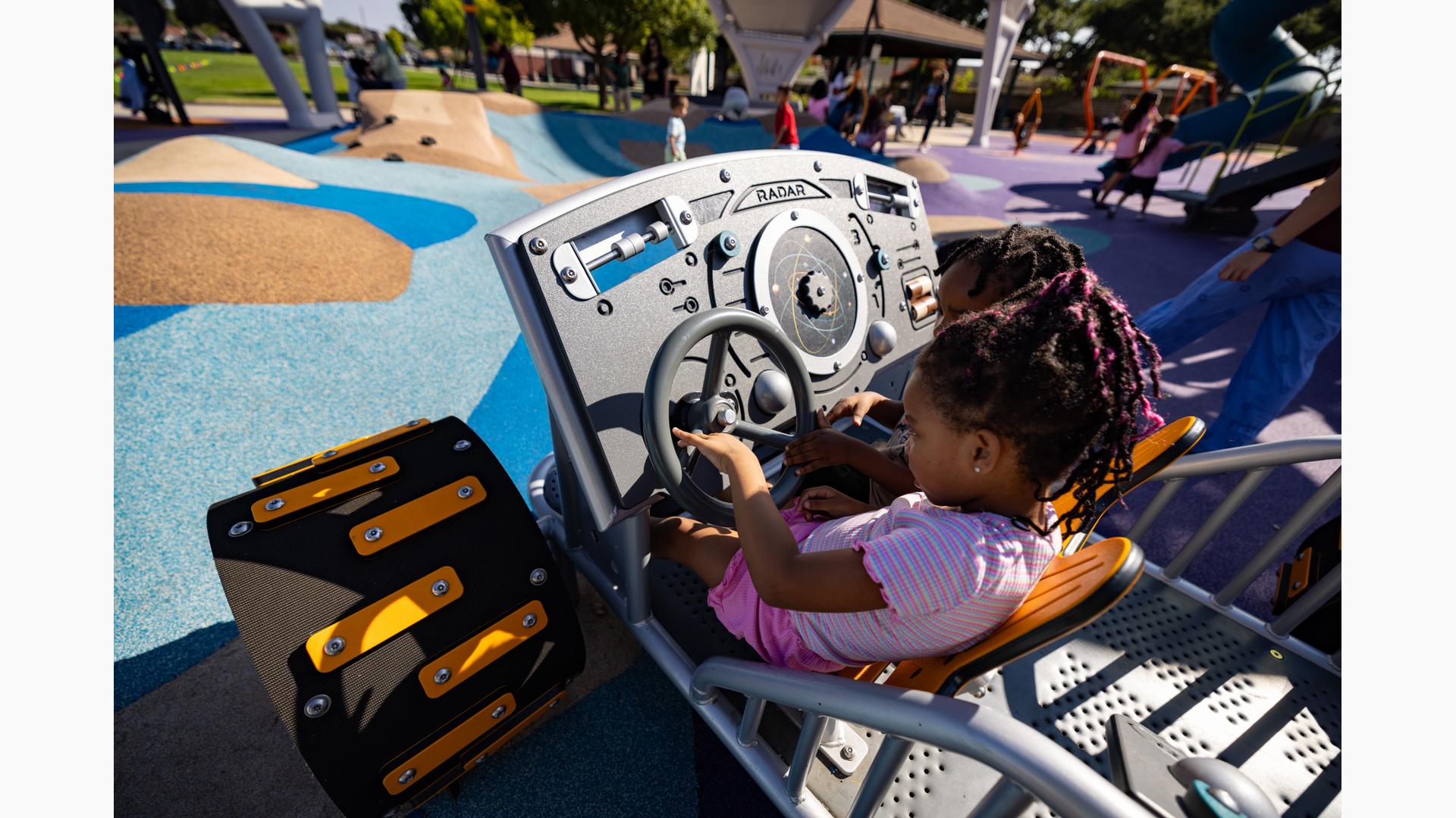 Soaring overhead, custom SkyWays® shade structures sweep across the play space in a futuristic arc, casting dramatic shapes against the sky. Beneath them, young explorers dive into a universe of discovery: twin rocket-shaped PlayBooster® towers that launch imaginations sky-high, a Hedra® Scout for preschoolers with its geometric playscape, and angular Hedra® swing frames that push the limits of design. The exhilarating Global Motion® spinner and multiple swing designs ensure that every child, caregiver, and community member finds their place in the adventure. Even the safety surfacing adds to the drama — its bold colors and bumpy textures mimic the rocky surface of another planet.
