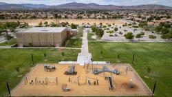 Video features a Landscape Structures playground at Oasis Park in Palmdale California. [video: scene fades into a view up to the corner of a brick building with lettering that reads "Palmdale Oasis Park Recreation Center". Scene fades to an elevated view of a park playground. Camera switches to a ground view focused on a slide with a spiral belted walkway leading to the top. Camera switches to a different view of the many play structures at the play area. Large circular hammock swings sit in front of a large bridge climber. Scene switches to a full elevated view of the entire play area with a double wide sidewalk leading to it. Camera switches to a full bird's eye view of the play area. Camera focuses on play panels suspended and fixed to the ground by ropes. Scene switches to another few of the play space showing seat spinners, climbers, and balance beams. Camera switches to an elevated view panning left to right showing different play structures with climbers of all types. Camera focuses on one of the circular hammock seats. Scene switches to another structure with climbers, ropes, and beams to play on. Camera flies over and through the different playground activities. Camera focuses on the metal connector of a rope ladder with the Landscape Structures logo embossed on it. Camera switches back to a fly overview of the different play structures. The camera jumps to different areas of the play area. Camera switches one again to a full elevated view of the play area and its large sidewalk reach towards the building also on the same property. Screen jumps to white. A black vertical line appears in the center of the screen. The Rec West Outdoor Products Inc. logo slides out from the black line to the right of the screen. Then the Landscape Structures logo slides out to the left of the line. Text fades in below both logos reading: For a better tomorrow we play today. Screen fades to black and video ends.]