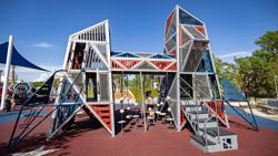 A stars-and-stripes theme adorns this exciting park in Parrish, Florida. Sky-high Alpha Link® Towers provide a lofty goal for climbers ages 5 to 12, and the payoff of a great view from the top. The towers are connected by a crawl tunnel, which adds an extra challenge for risk-takers. A Hedra® playstructure is a multifaceted play experience with a futuristic look that is as intriguing to kids as it is fun, with many hidden play features and areas to explore. Children ages 2 to 5 will enjoy the age-appropriate Hedra Scout®, which is sized appropriately for them. A multi-bay Hedra swing set continues the angular design style, while providing the classic playground thrill of swinging for different ages, while an inclusive We-Go-Swing® allows kids with and without mobility devices to join the swinging fun. Several features make use of an adjacent grassy hillside to provide extra play value in the form of a tunnel slide that descends the slope and two freestanding spinners that perch at the top. What’s more, elegant SkyWays® shade sails provide coverage from the hot sun, so the play can continue all day.