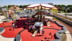 The park’s extraordinary flower theme gains its inspiration from the pink, fuchsia and white camellia flowers that adorn Temple City’s logo and city seal, and nods to the adjacent street name, Primrose Ave. The motif suffuses the park in multiple creative ways—in the towering custom flower-shaped SkyWays® shade structures, the sprawling, red-petaled blossoms that make up the durable playground surfacing, and the flower-shaped fountain, to name just a few.