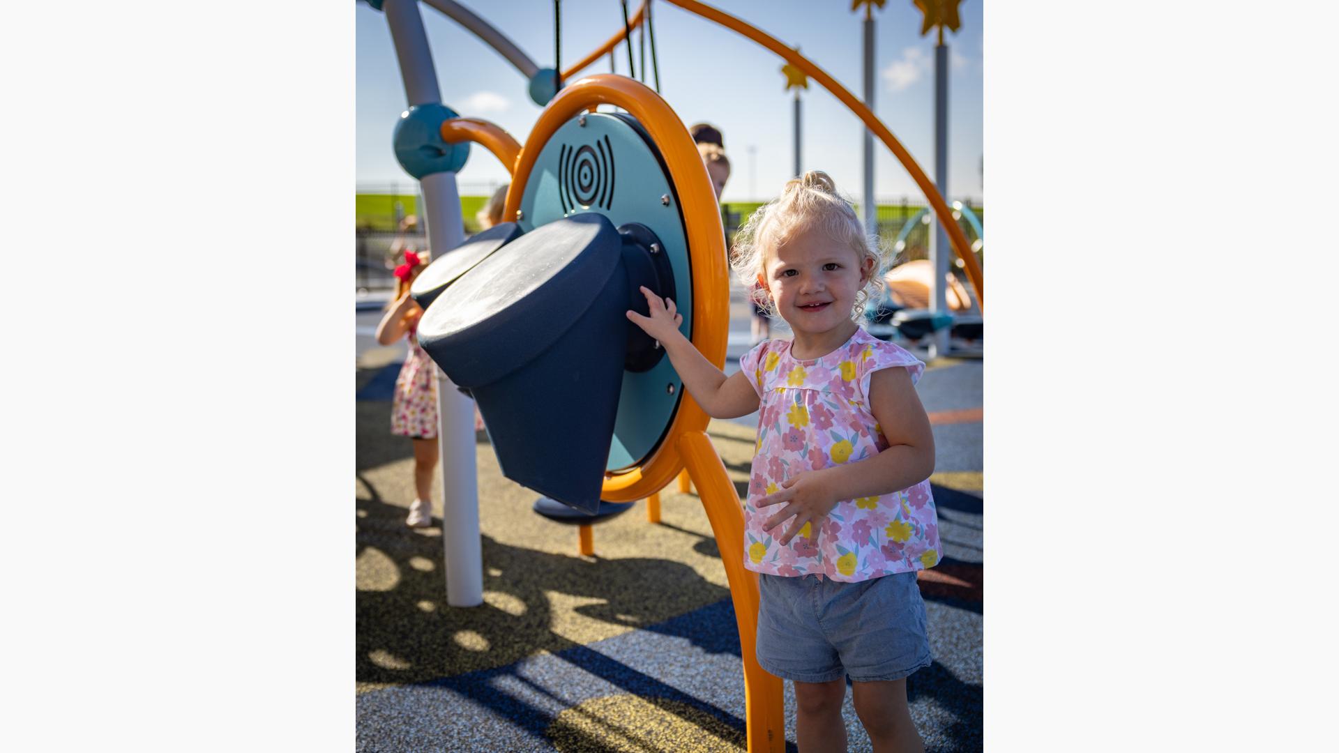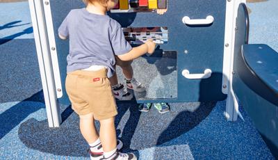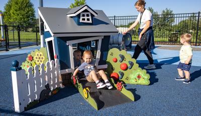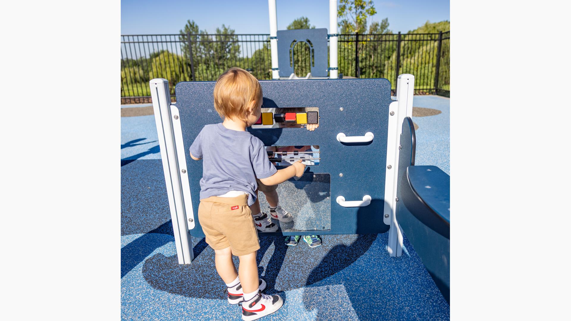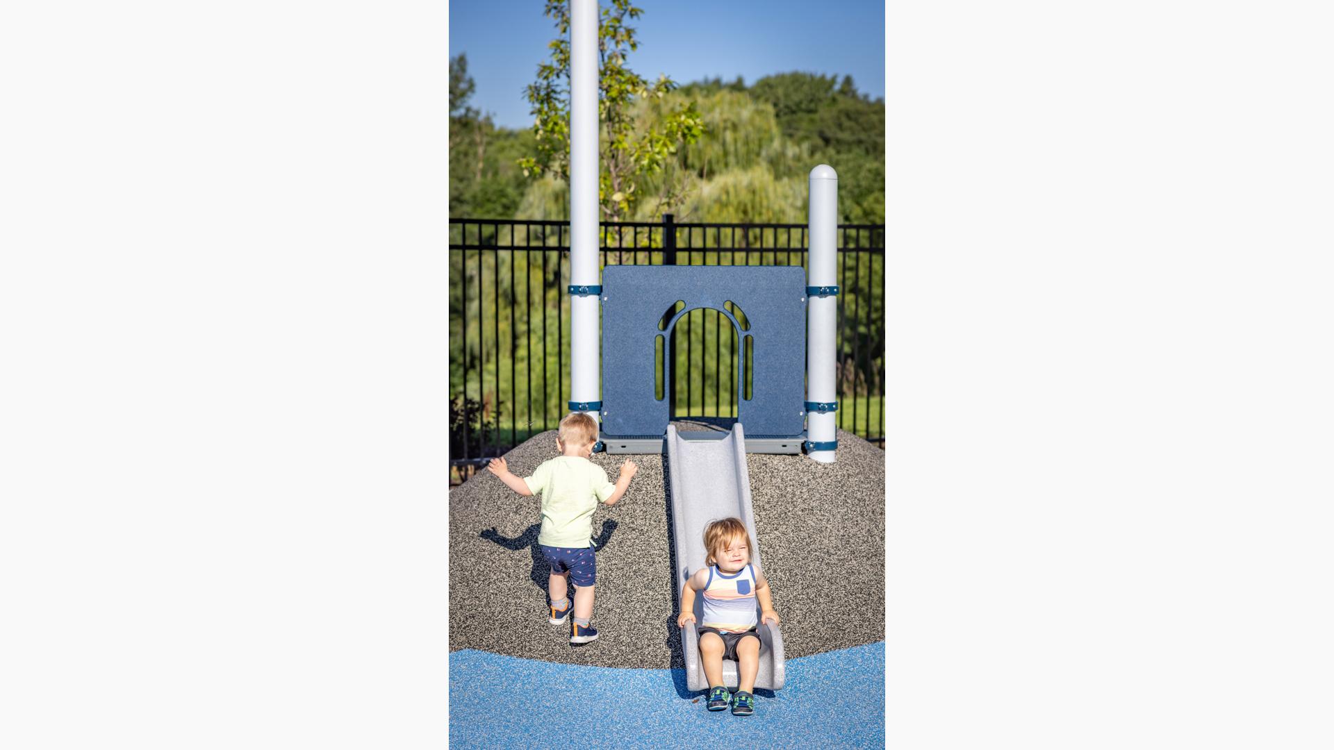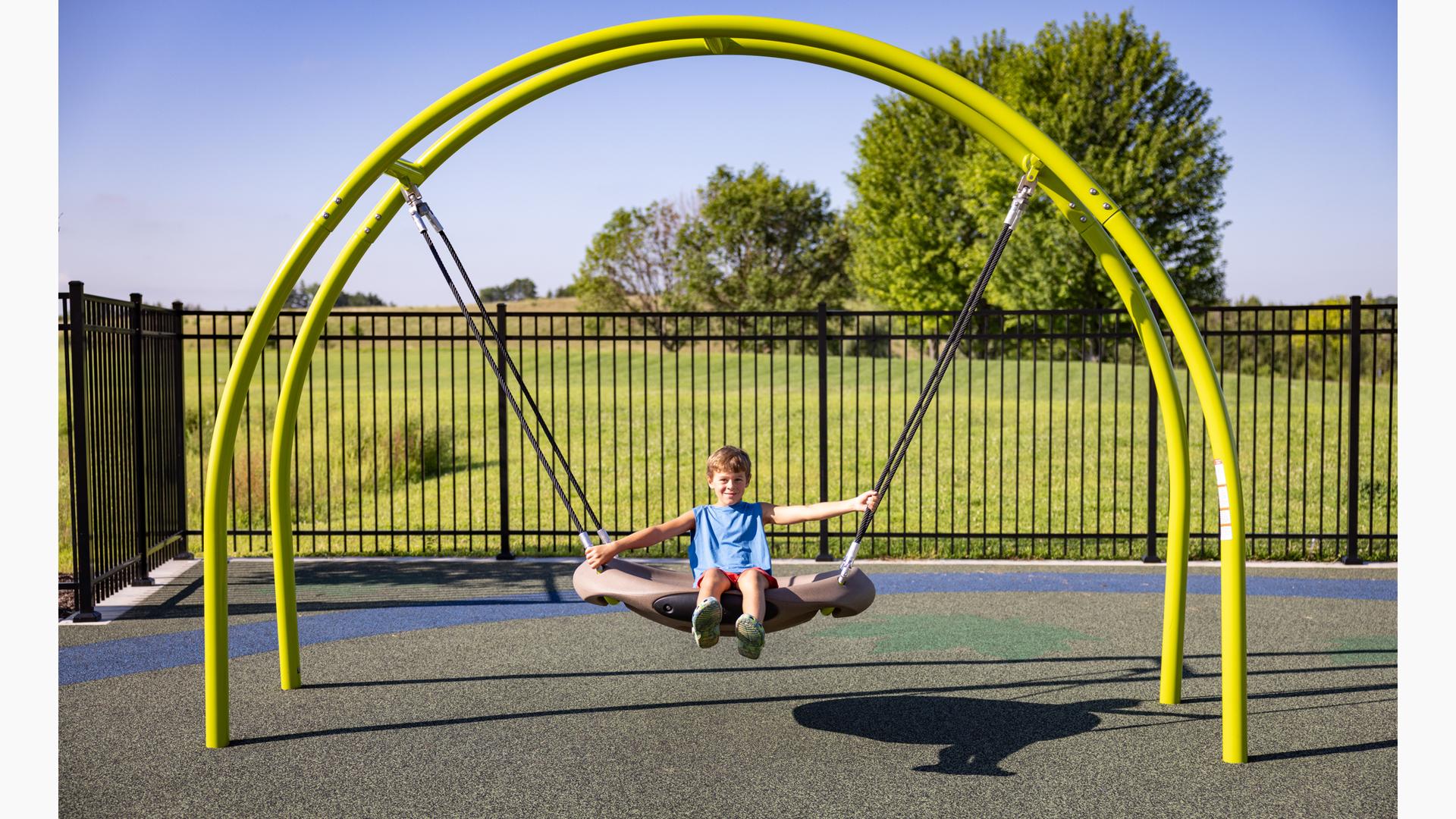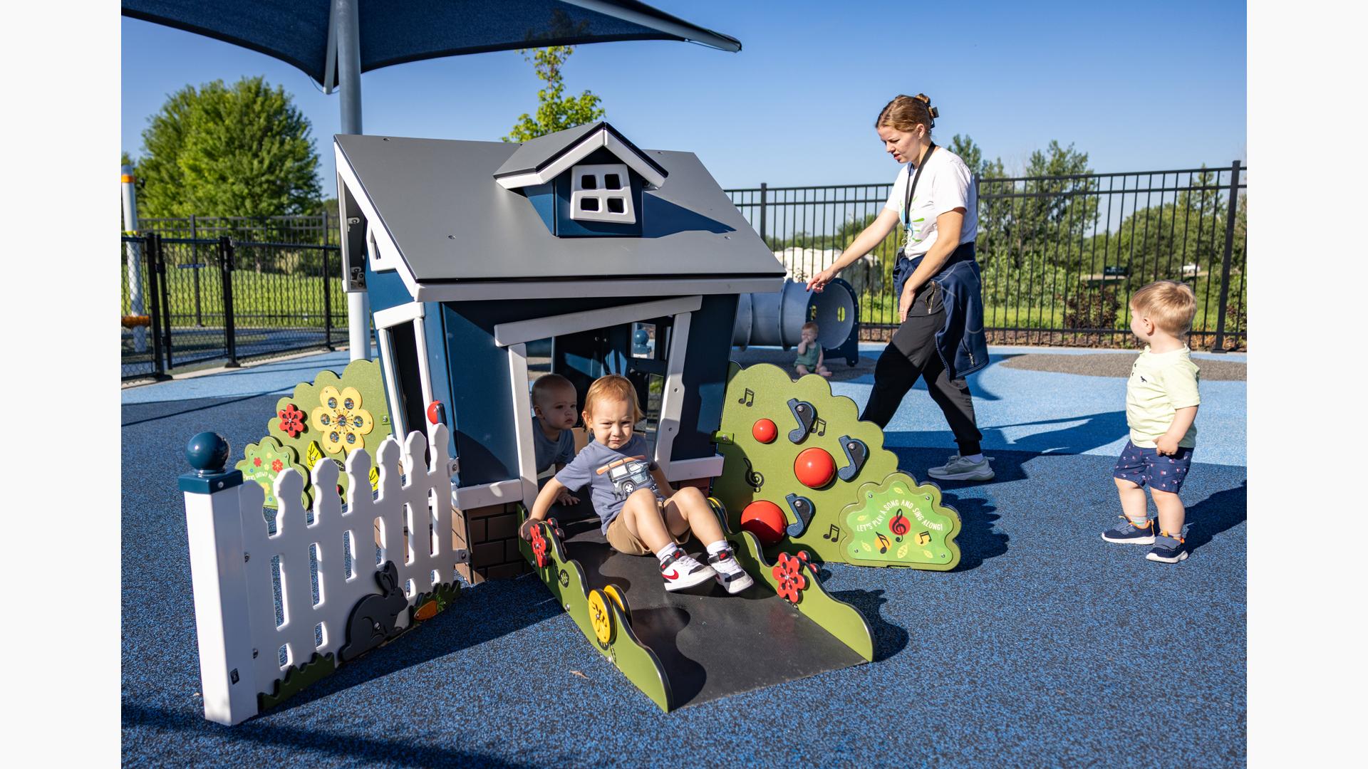 Colorful, hilly safety surfacing sweeps through the half-circle layout, guiding movement and discovery. Sensory panels, a Cozy Dome®, an Oodle® Swing, and inclusive surfacing ensure every child can play, reflect, and belong.