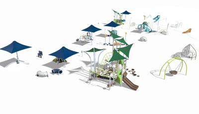 Animated rendering of a park play area with modern design play structures colored in teal with yellow accents. Surrounding trees leaves are yellowing and browning.