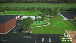 [video: the landscape structures logo shrinks and shifts to the bottom right corner of the screen while the text in the left corner appears simultaneously reading: Tree Tops. An animated full elevated view of the back of a school equipped with soccer fields and a playground comes into focus. The view slowly pans closer and closer to the playground area with a Tree Tops 6359 design. The scene fades to a full side view of an animated rendering of a Tree Tops playground with children playing. The view circles around the playground showing the different slides and climbers. Scene fades again to an elevated view of the playground triangular shades. Animated children of all abilities play at the different playground activities. The view slowly rotates around the playground for a better view of all the play activities. Scene fades to a view of an animated child seated in a wheelchair playing at a play panel. The view slowly pans in towards the central climbing area of the playground. Animated children play on the