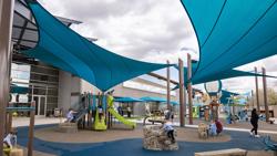 Contact Your ConsultantThis beautifully designed early childhood playground at Valley of the Sun J in Scottsdale, Arizona features lovely cool-blue shade sails, a Smart Play® Breeze® and lots more for children aged 2 to 5. The hot-air-balloon-themed Breeze provides tons of age-appropriate play in a compact space, while the Loft playhouse ignites the imagination. Nature-based GFRC play features like Log Steppers and several Rock Climbers add a woodsy feel to the whole area as well as intriguing texture for young hands to explore. Numerous Rhapsody® outdoor musical instruments provide auditory experience, while freestanding items like the Wee-Planet™ Climber and the OmniSpin® Spinner offer fun gross motor opportunities. Overall, SkyWays® shade structures keep everyone comfortable and protected from the sun, so the play can last as long as possible.